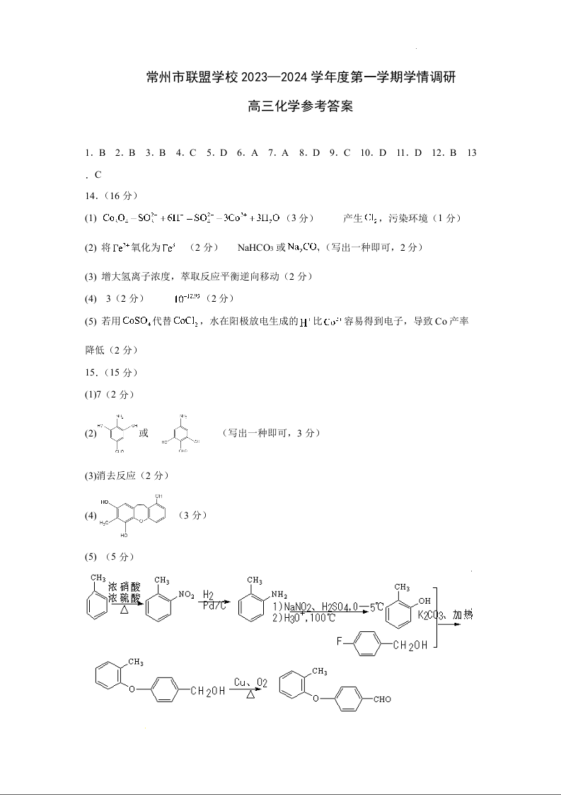 江苏省常州市联盟学校2024届高三上学期12月学情调研 化学答案