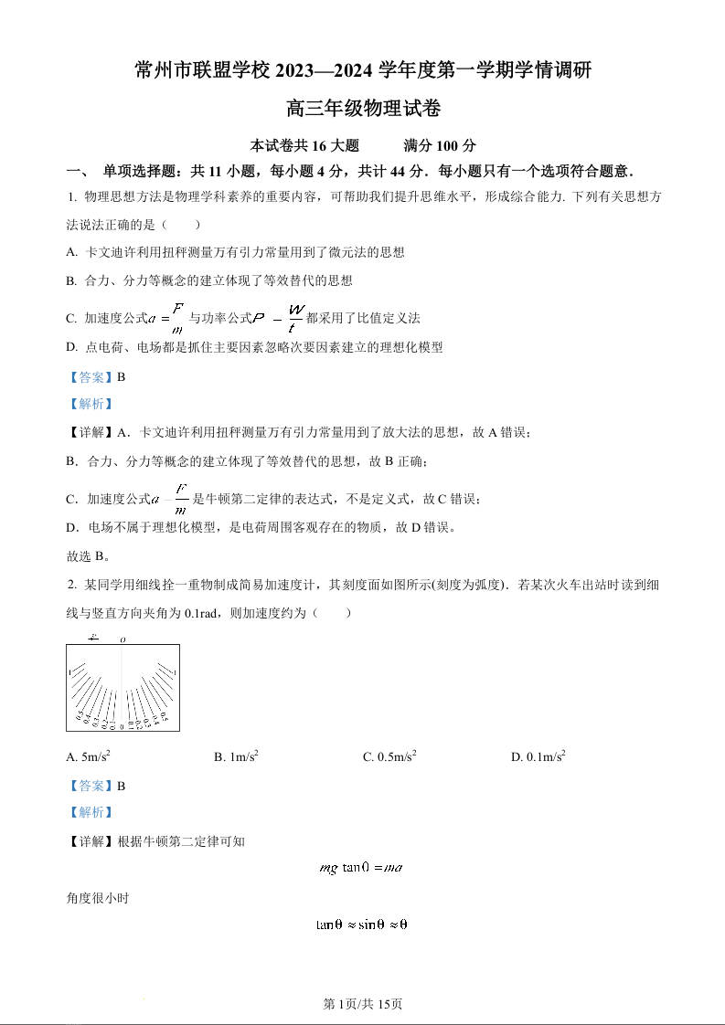 江苏省常州市联盟学校2024届高三上学期12月学情调研 物理答案