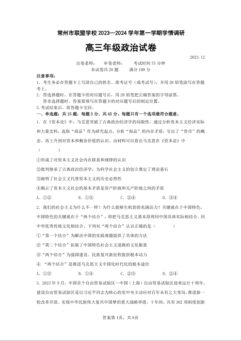 江苏省常州市联盟学校2024届高三上学期12月学情调研 政治