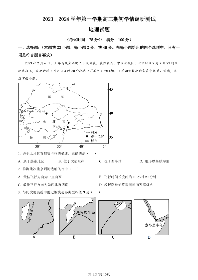 江苏省高邮市2023-2024学年高三上学期期初学情调研测试 地理