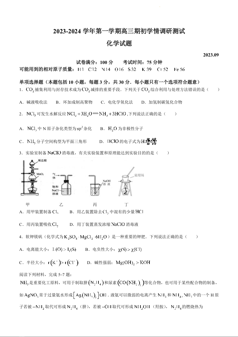江苏省高邮市2023-2024学年高三上学期期初学情调研测试 化学