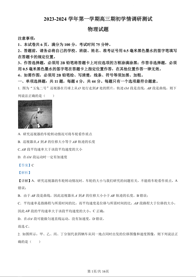 江苏省高邮市2023-2024学年高三上学期期初学情调研测试 物理解析