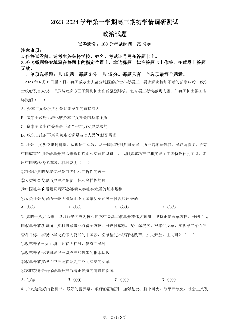 江苏省高邮市2023-2024学年高三上学期期初学情调研测试 政治