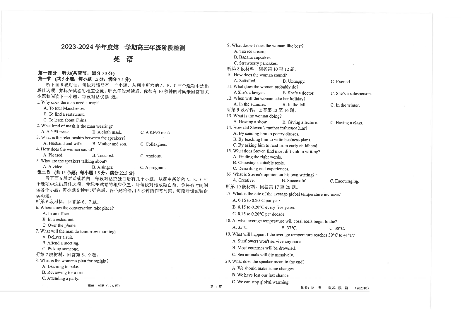 江苏省海安高级中学2023-2024学年高三上学期10月月考试题 英语