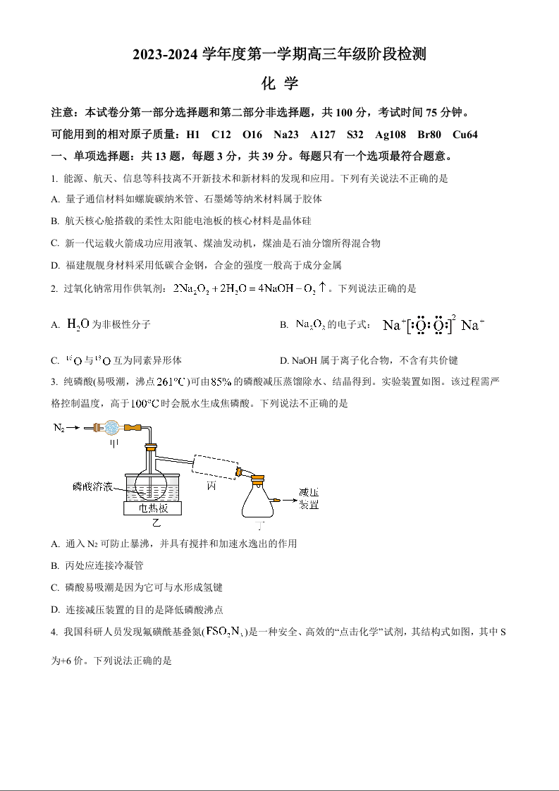 江苏省海安高级中学2023-2024学年高三上学期10月月考试题 化学
