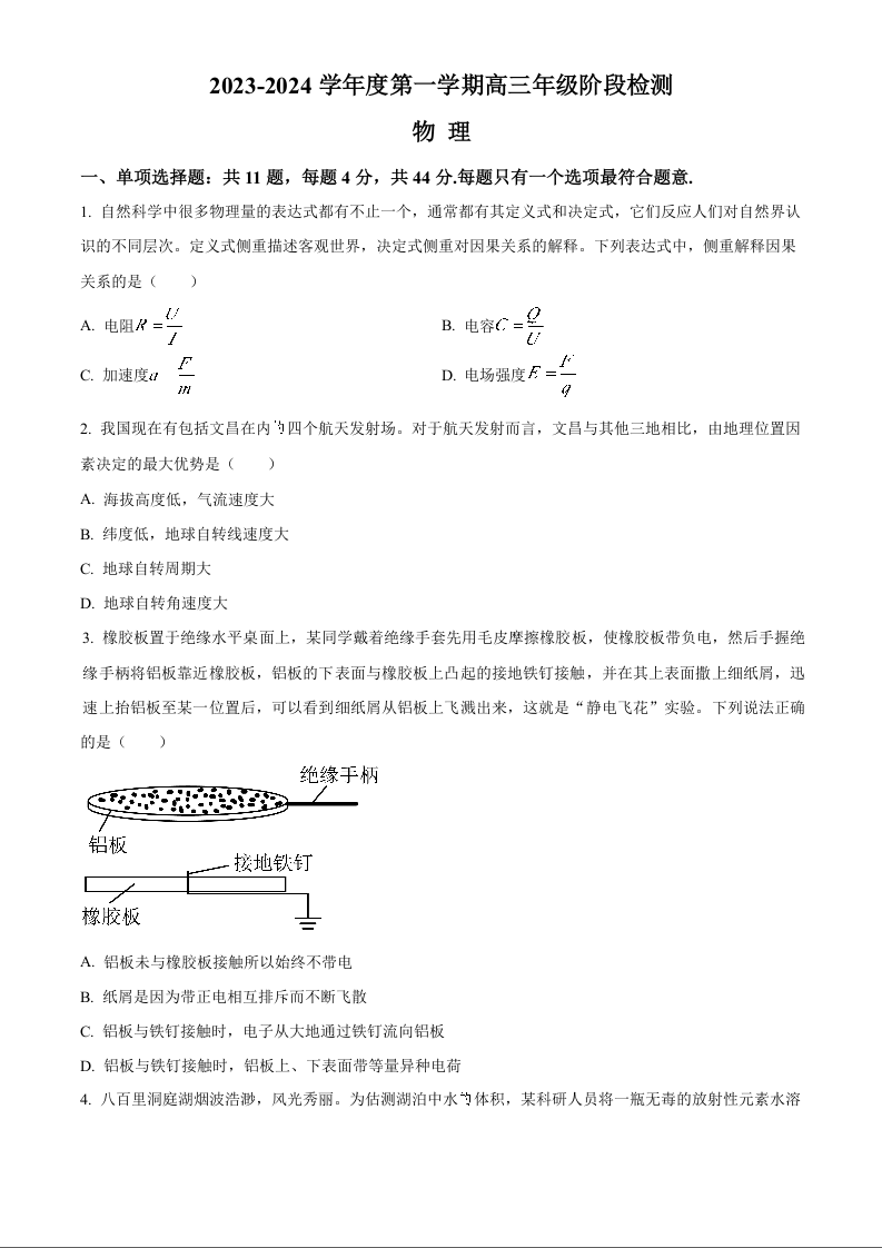 江苏省海安高级中学2023-2024学年高三上学期10月月考试题 物理