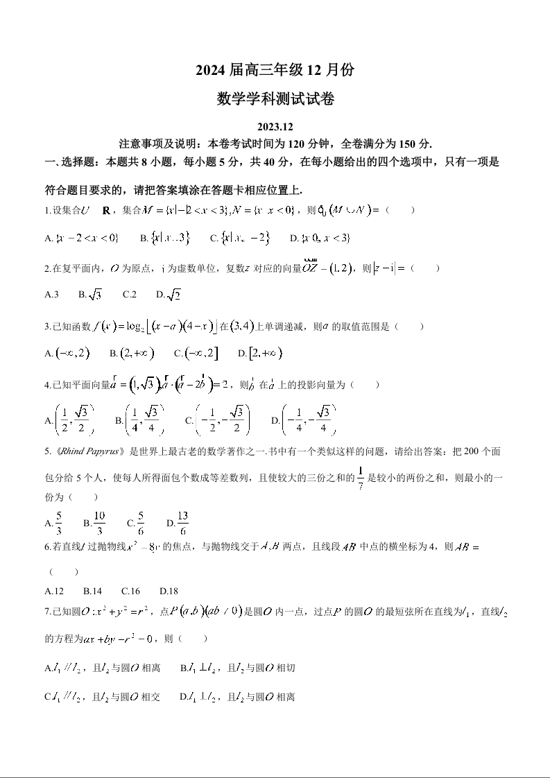江苏省海安高级中学2023-2024学年高三上学期12月月考试题 数学