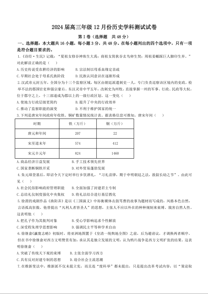 江苏省海安高级中学2023-2024学年高三上学期12月月考试题 历史