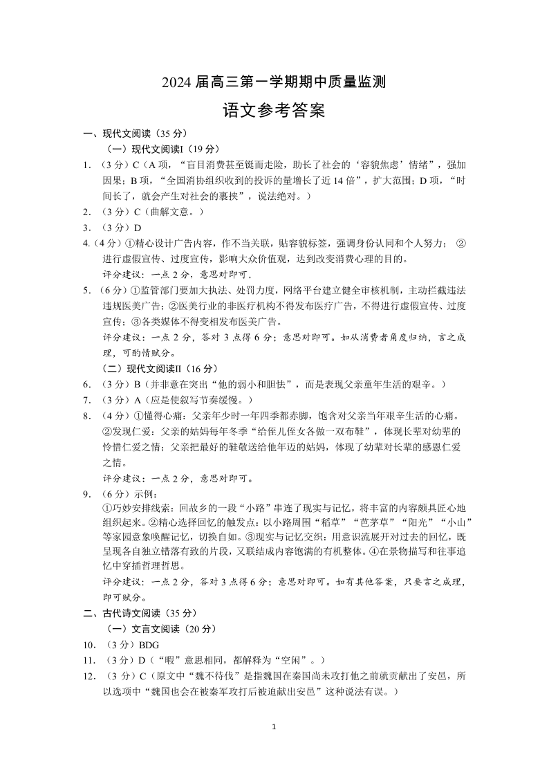 江苏省淮安、南通部分学校2023-2024学年高三上学期11月期中监测 语文答案