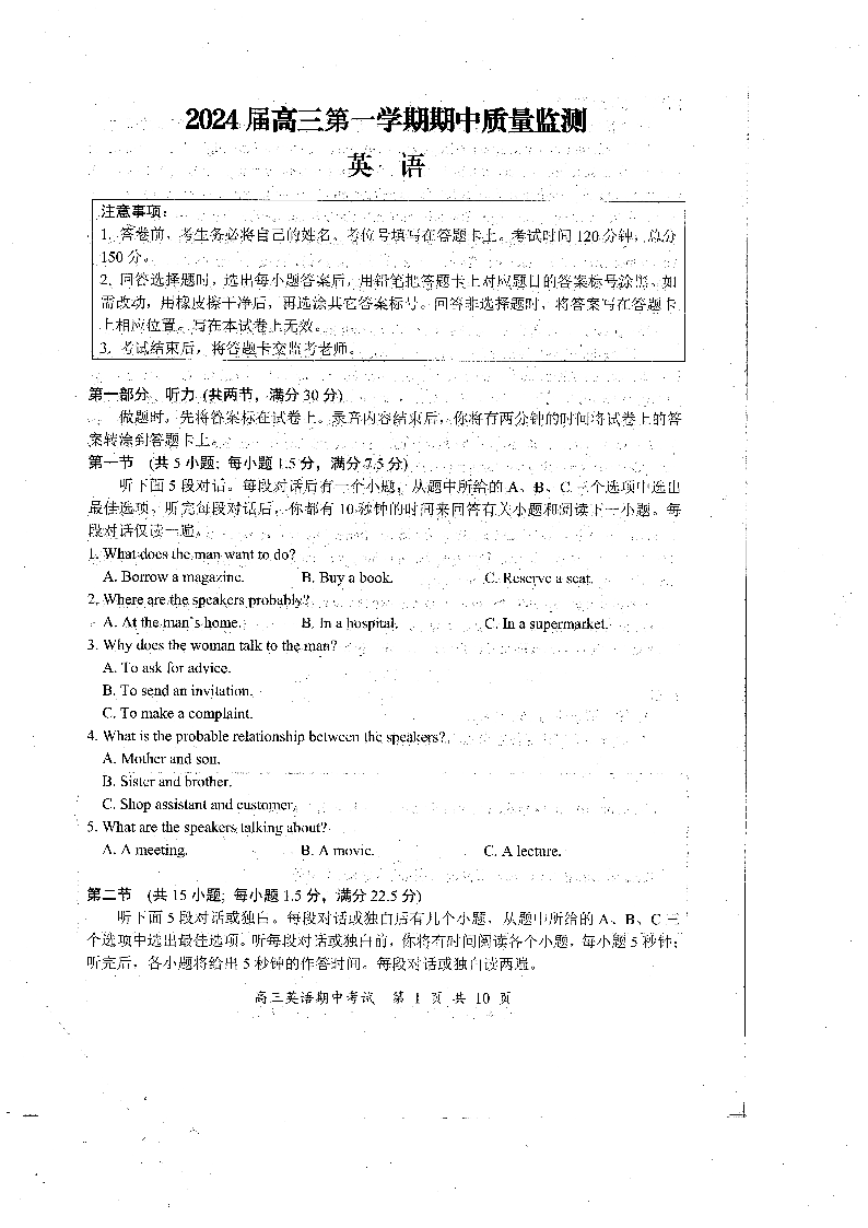 江苏省淮安、南通部分学校2023-2024学年高三上学期11月期中监测 英语