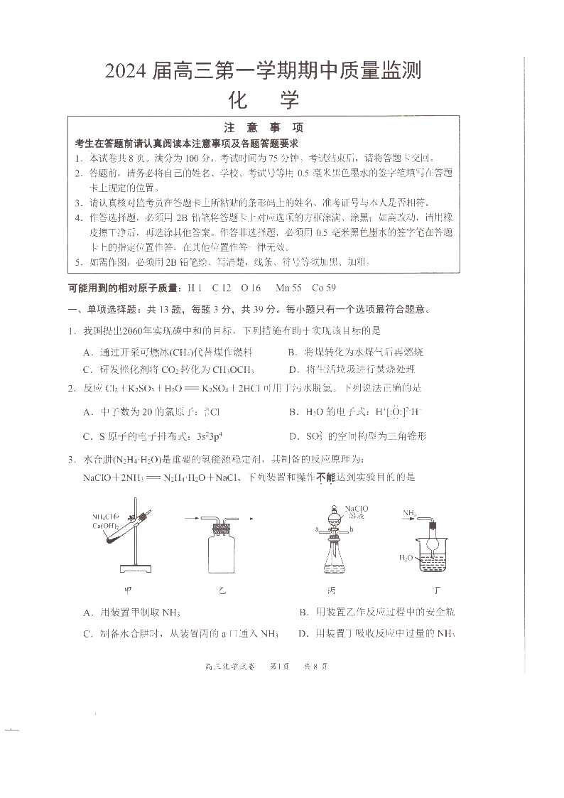 江苏省淮安、南通部分学校2023-2024学年高三上学期11月期中监测 化学