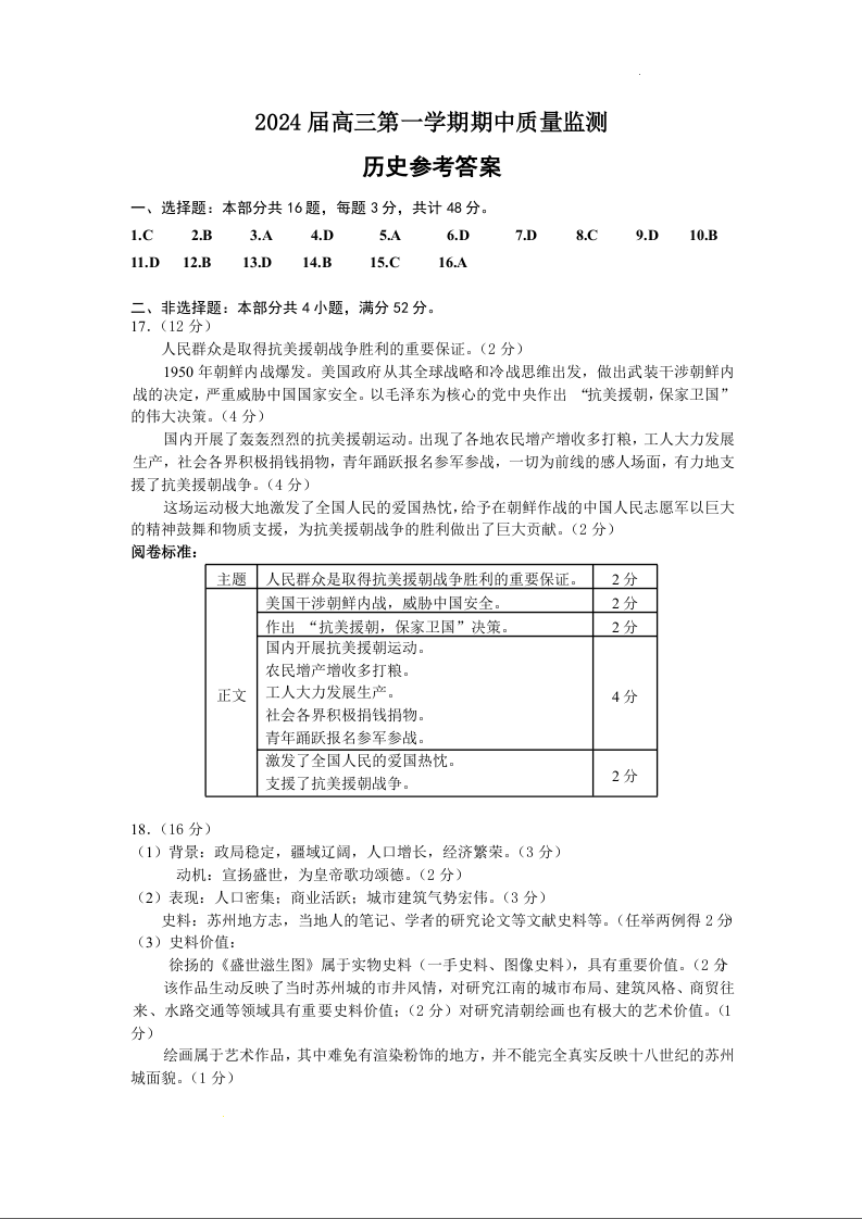 江苏省淮安、南通部分学校2023-2024学年高三上学期11月期中监测 历史答案