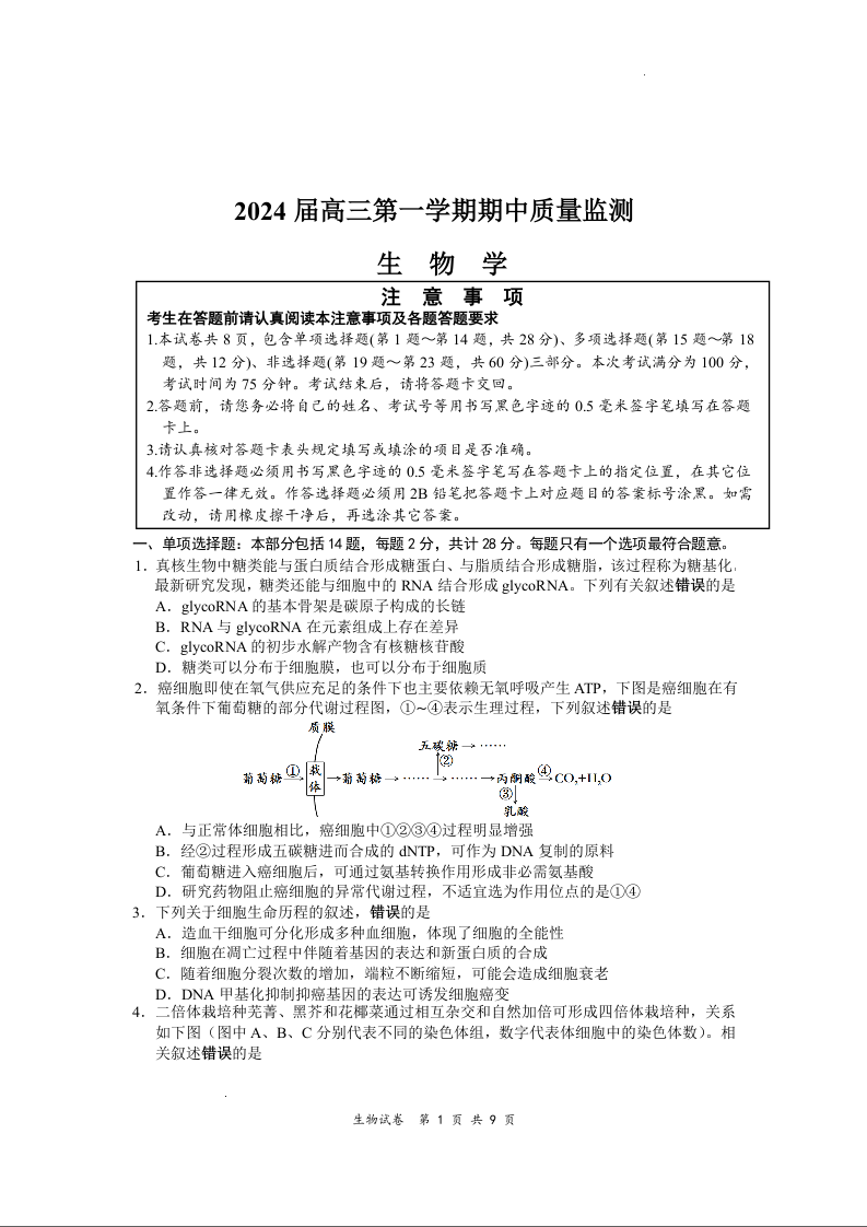 江苏省淮安、南通部分学校2023-2024学年高三上学期11月期中监测 生物
