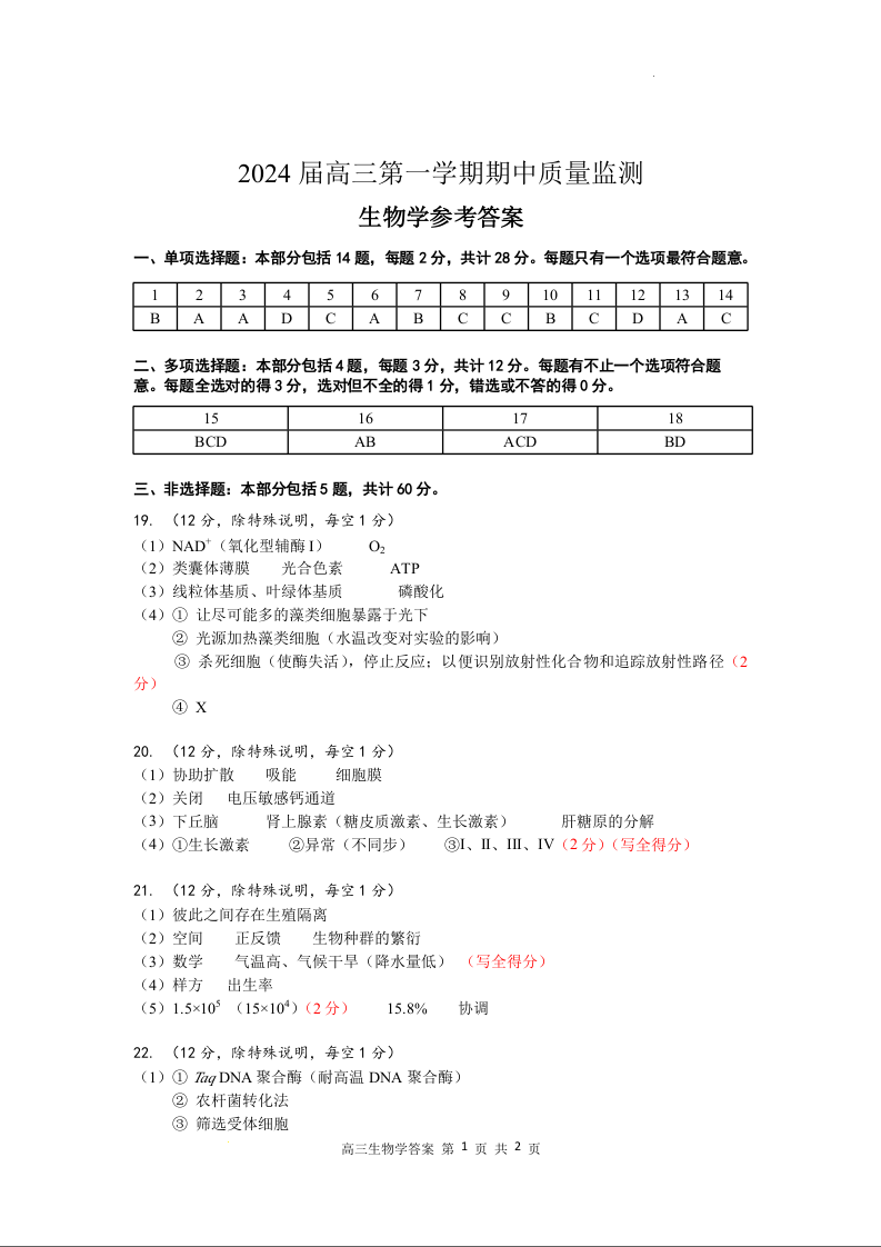江苏省淮安、南通部分学校2023-2024学年高三上学期11月期中监测 生物答案