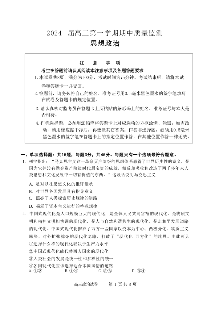 江苏省淮安、南通部分学校2023-2024学年高三上学期11月期中监测 政治