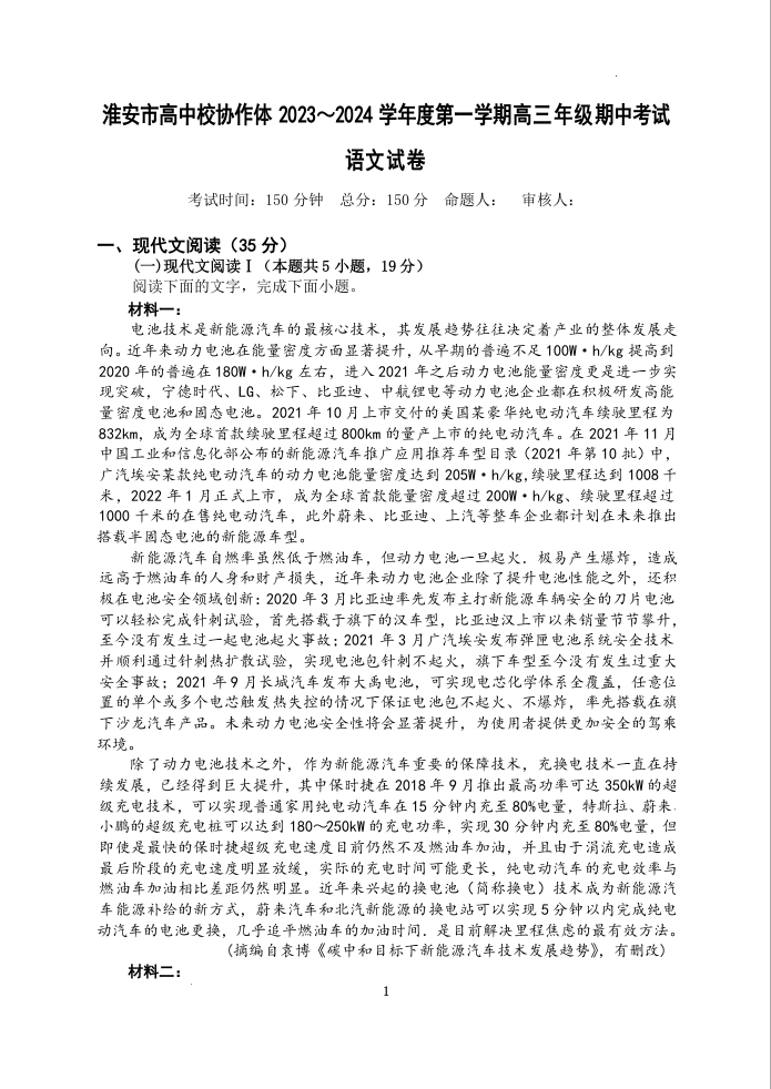 江苏省淮安市高中校协作体2023-2024学年高三上学期期中联考 语文