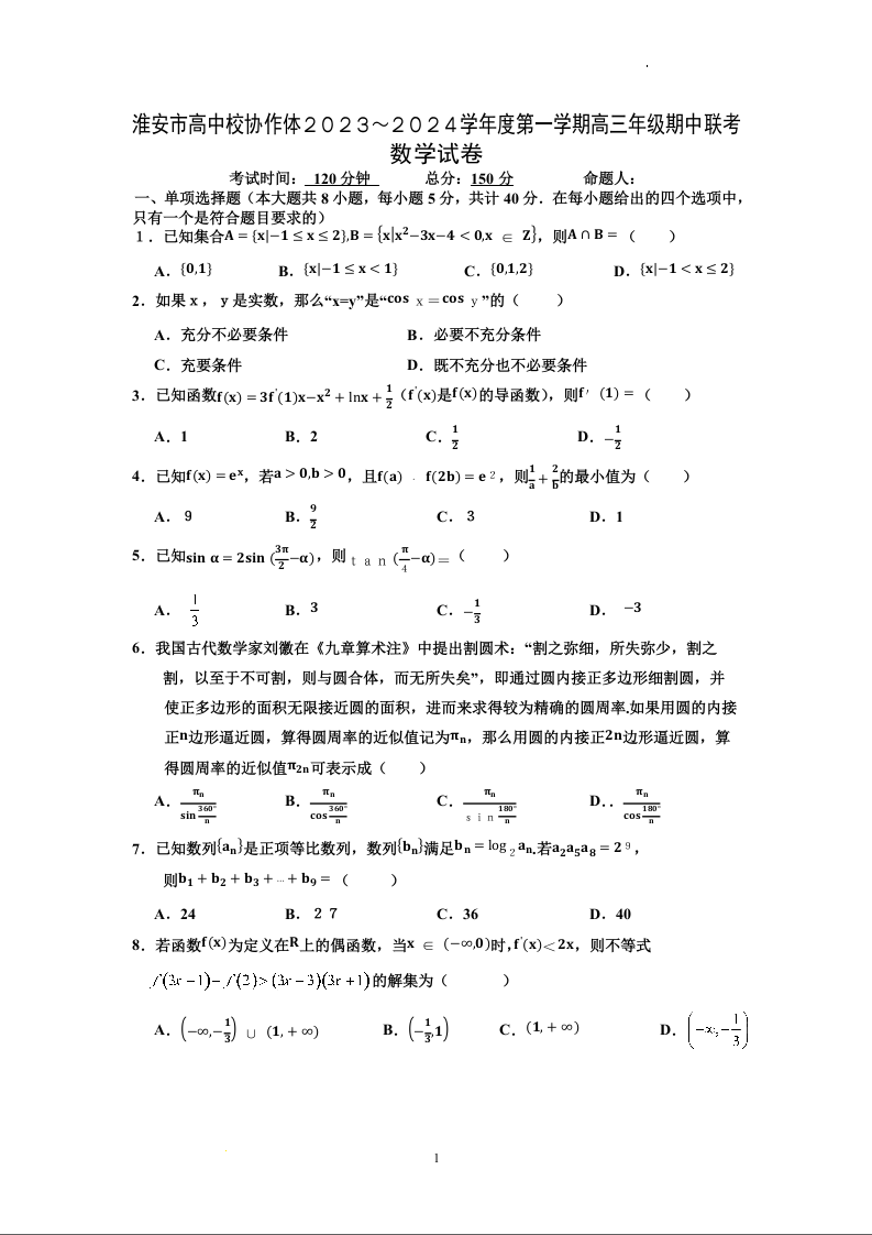 江苏省淮安市高中校协作体2023-2024学年高三上学期期中联考 数学