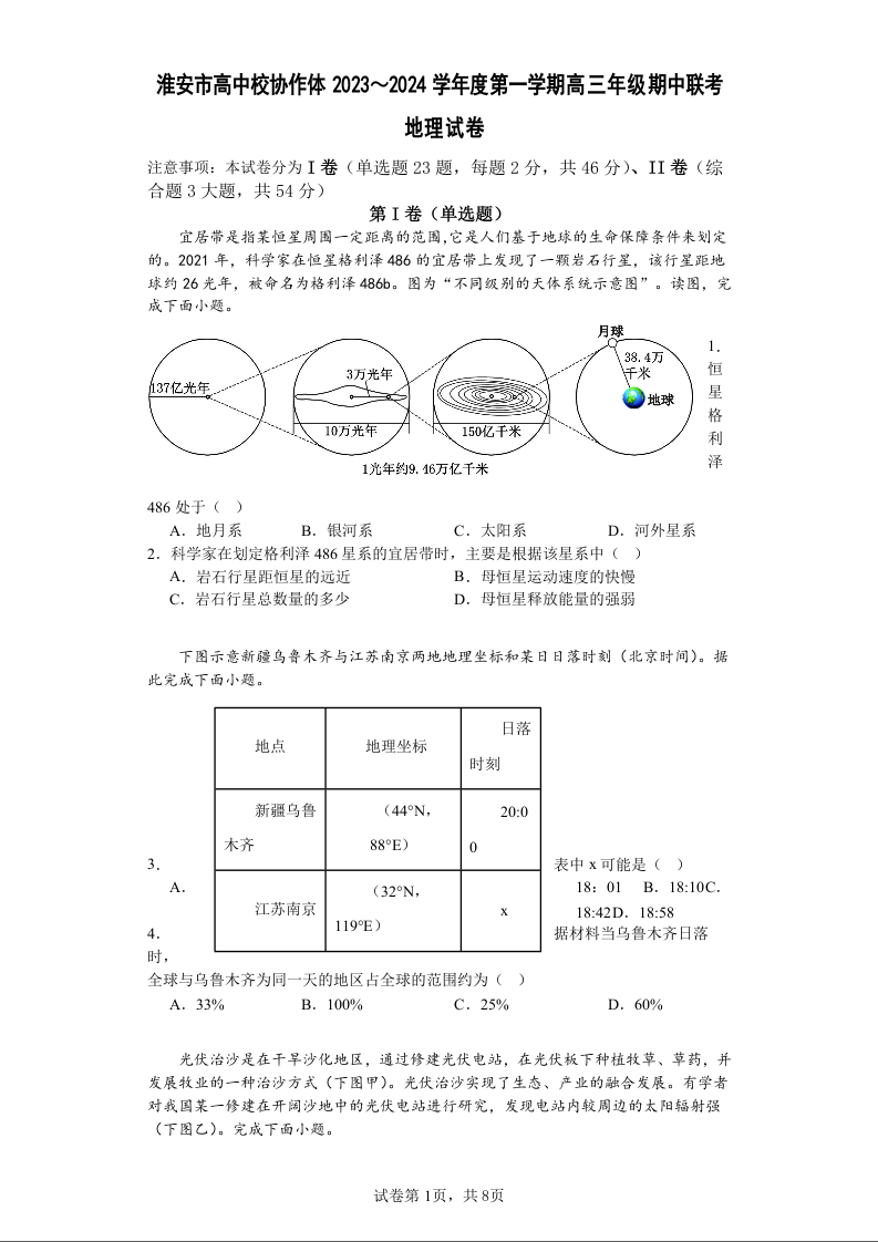 江苏省淮安市高中校协作体2023-2024学年高三上学期期中联考 地理