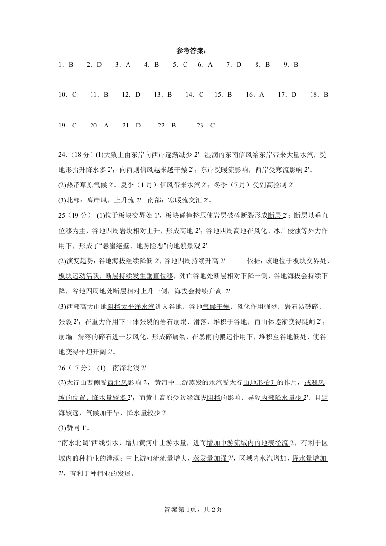 江苏省淮安市高中校协作体2023-2024学年高三上学期期中联考 地理答案