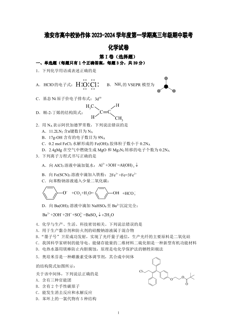 江苏省淮安市高中校协作体2023-2024学年高三上学期期中联考 化学