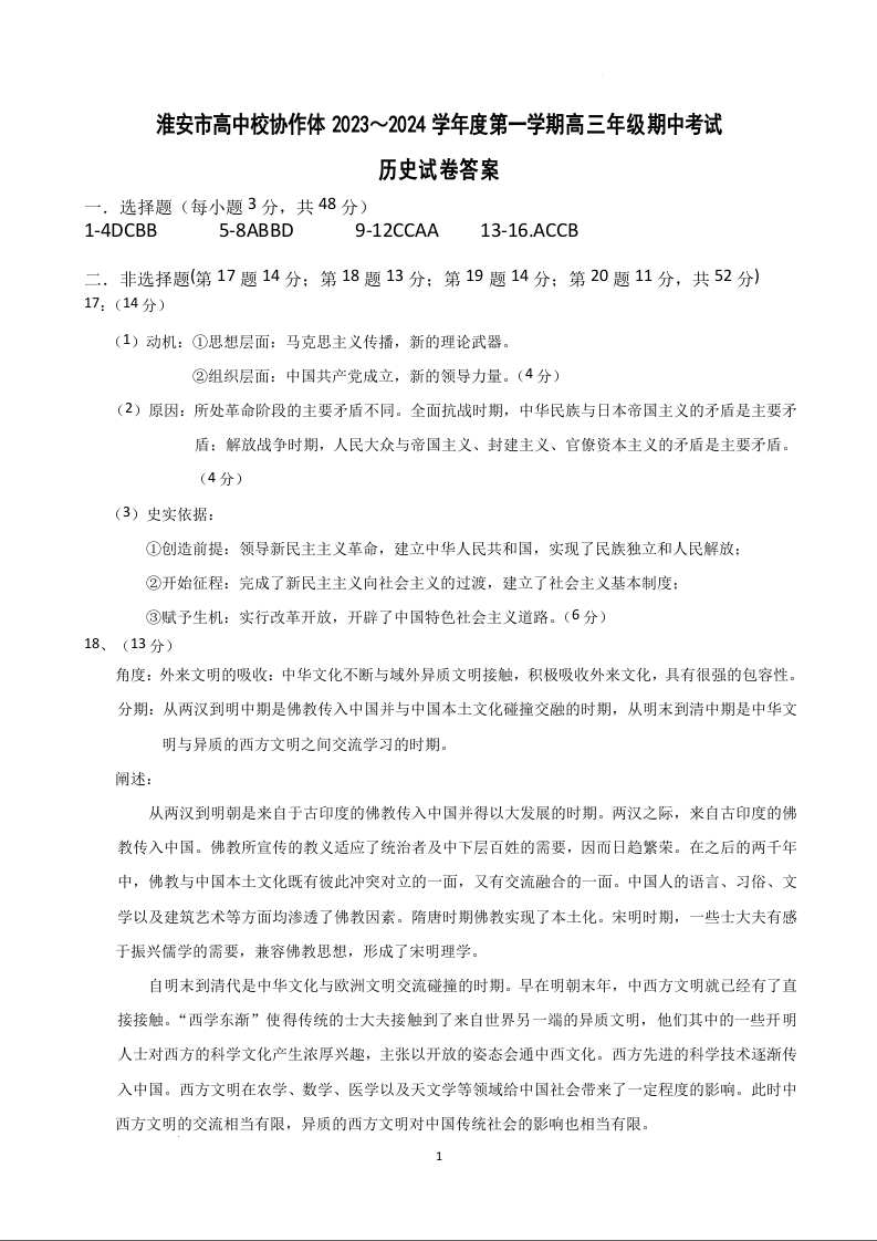 江苏省淮安市高中校协作体2023-2024学年高三上学期期中联考 历史答案