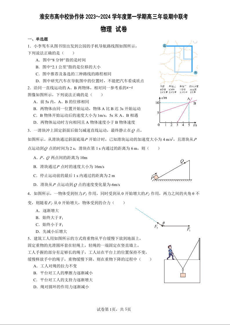 江苏省淮安市高中校协作体2023-2024学年高三上学期期中联考 物理