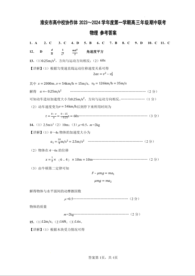 江苏省淮安市高中校协作体2023-2024学年高三上学期期中联考 物理答案