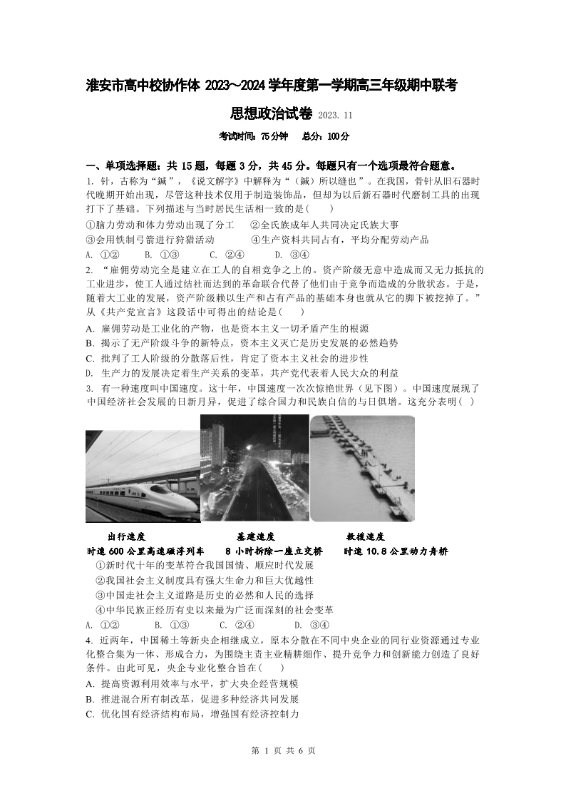 江苏省淮安市高中校协作体2023-2024学年高三上学期期中联考 政治