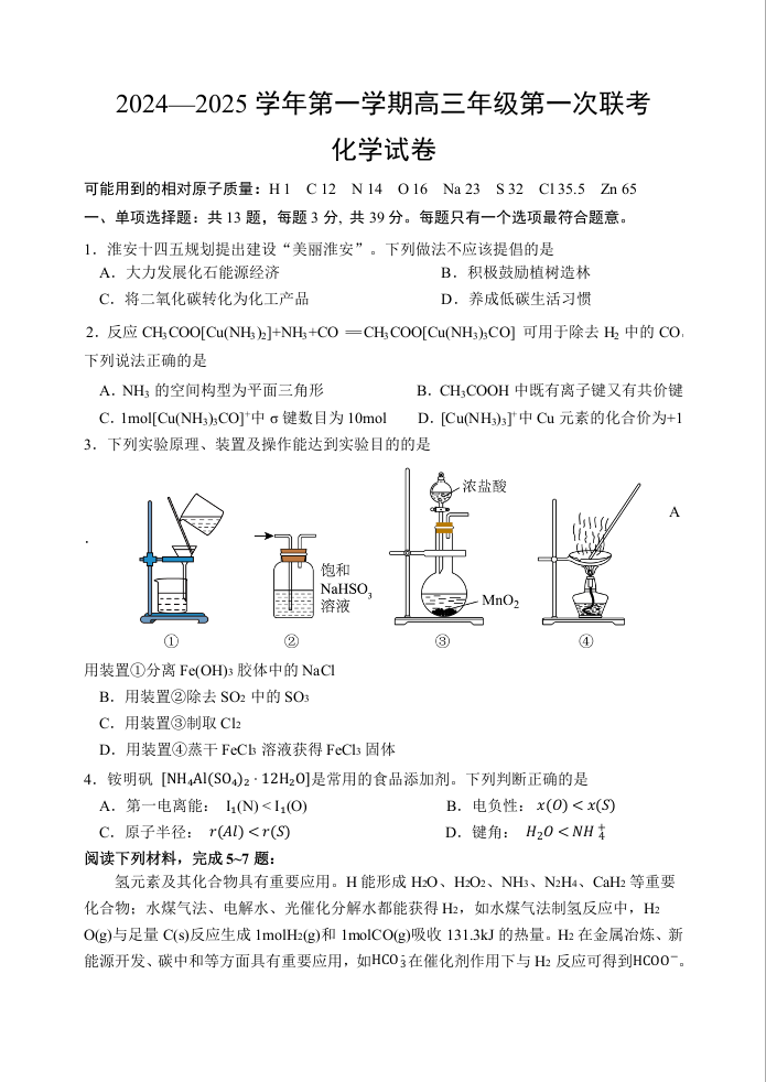 江苏省淮安市十校2024-2025学年高三上学期第一次联考+化学