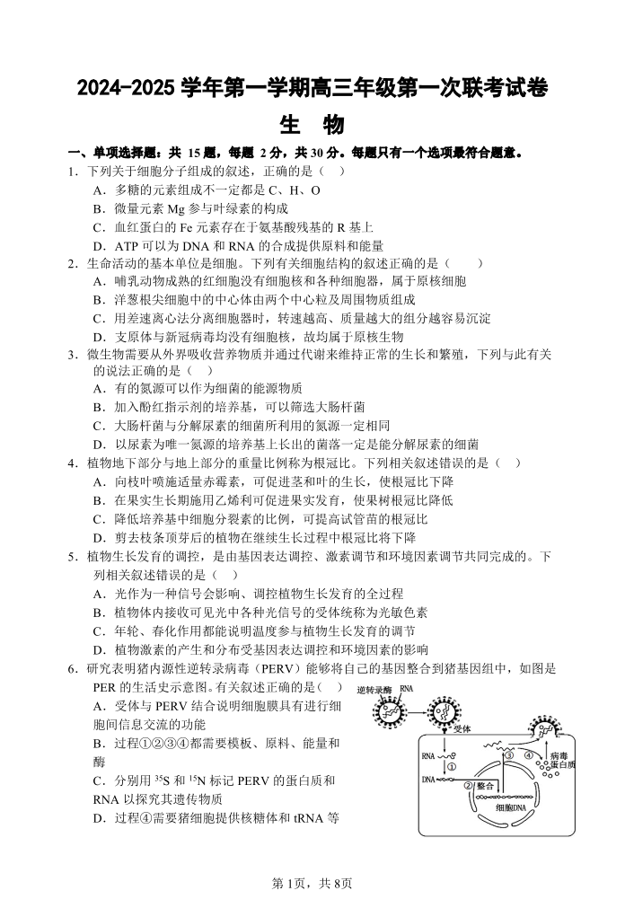 江苏省淮安市十校2024-2025学年高三上学期第一次联考+生物