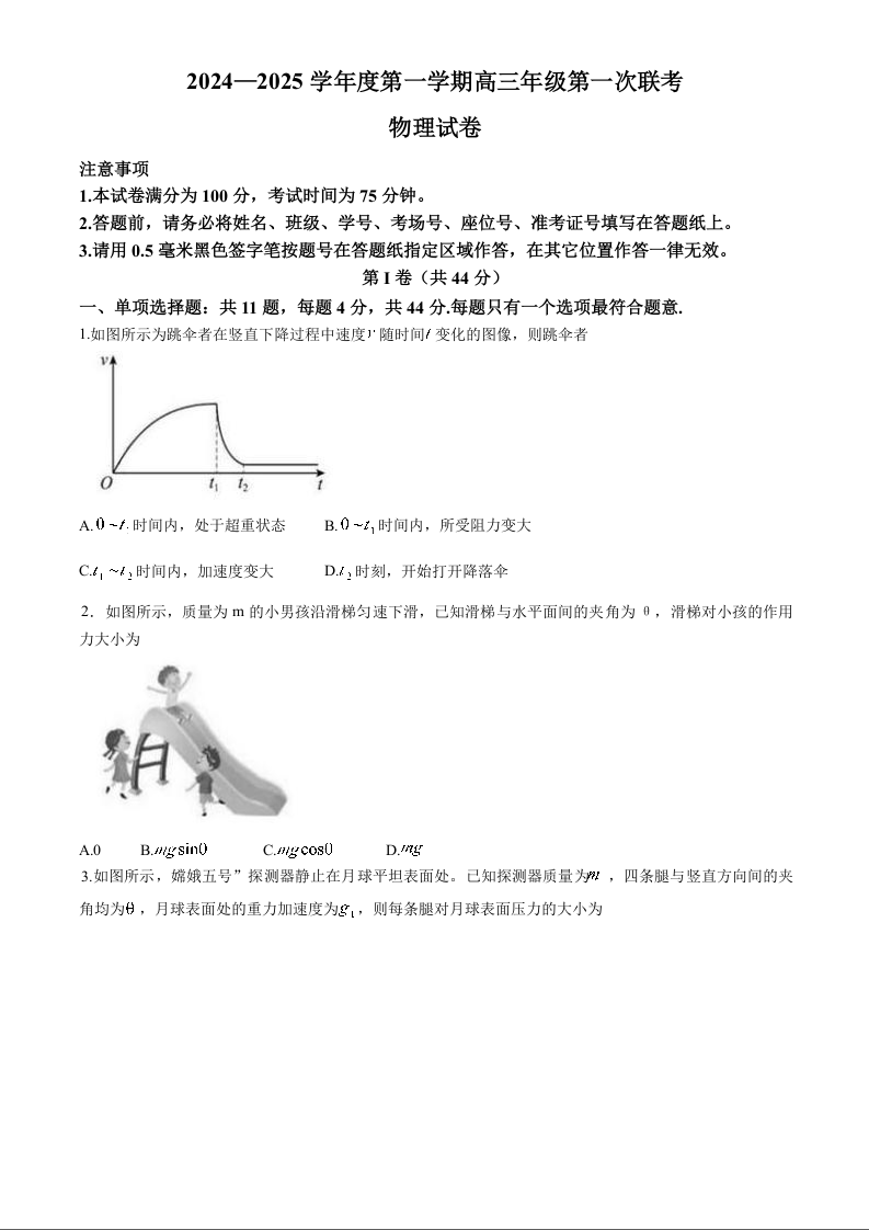 江苏省淮安市十校2024-2025学年高三上学期第一次联考+物理