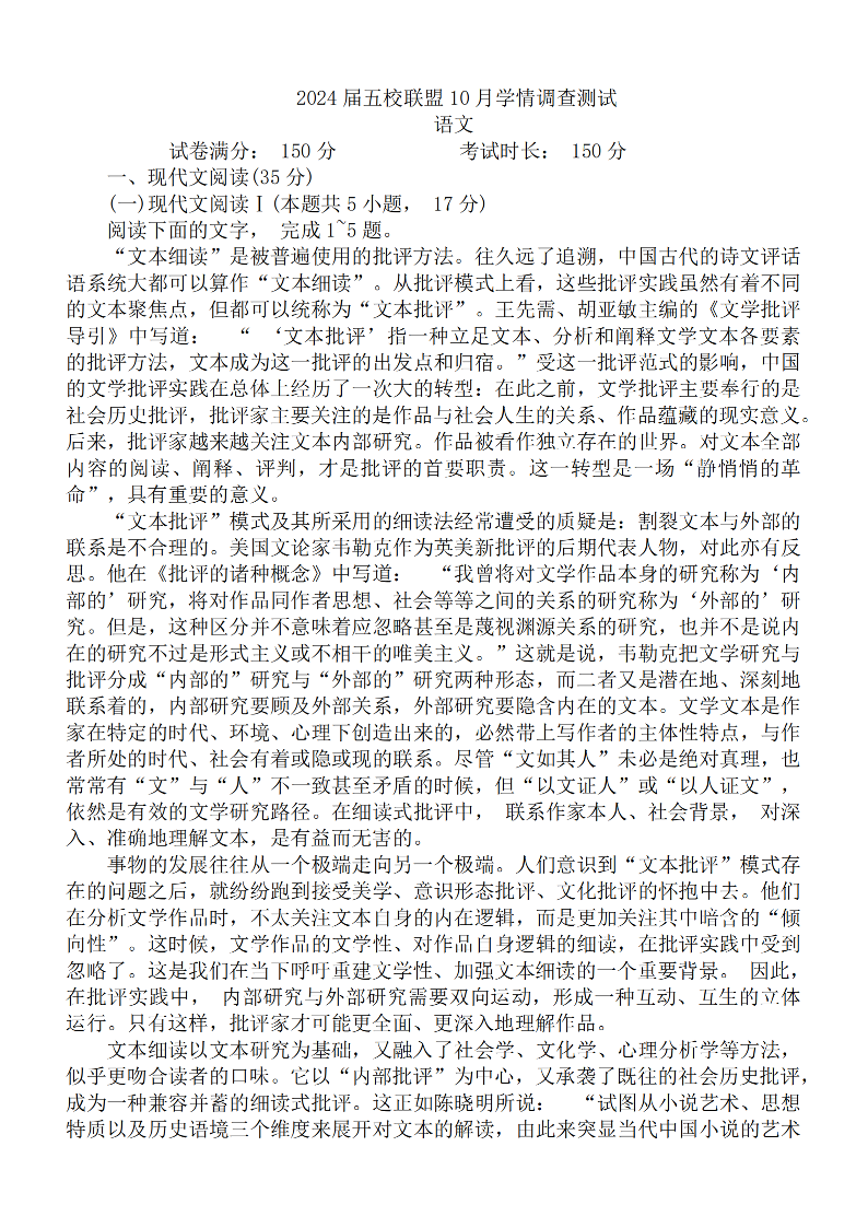 江苏省淮安市五校联盟2023-2024学年高三上学期10月学情调查测试 语文