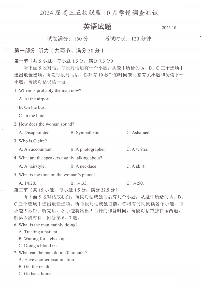 江苏省淮安市五校联盟2023-2024学年高三上学期10月学情调查测试 英语