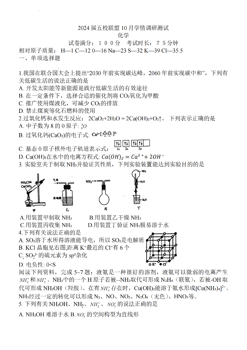 江苏省淮安市五校联盟2023-2024学年高三上学期10月学情调查测试 化学