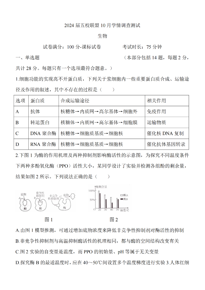 江苏省淮安市五校联盟2023-2024学年高三上学期10月学情调查测试 生物