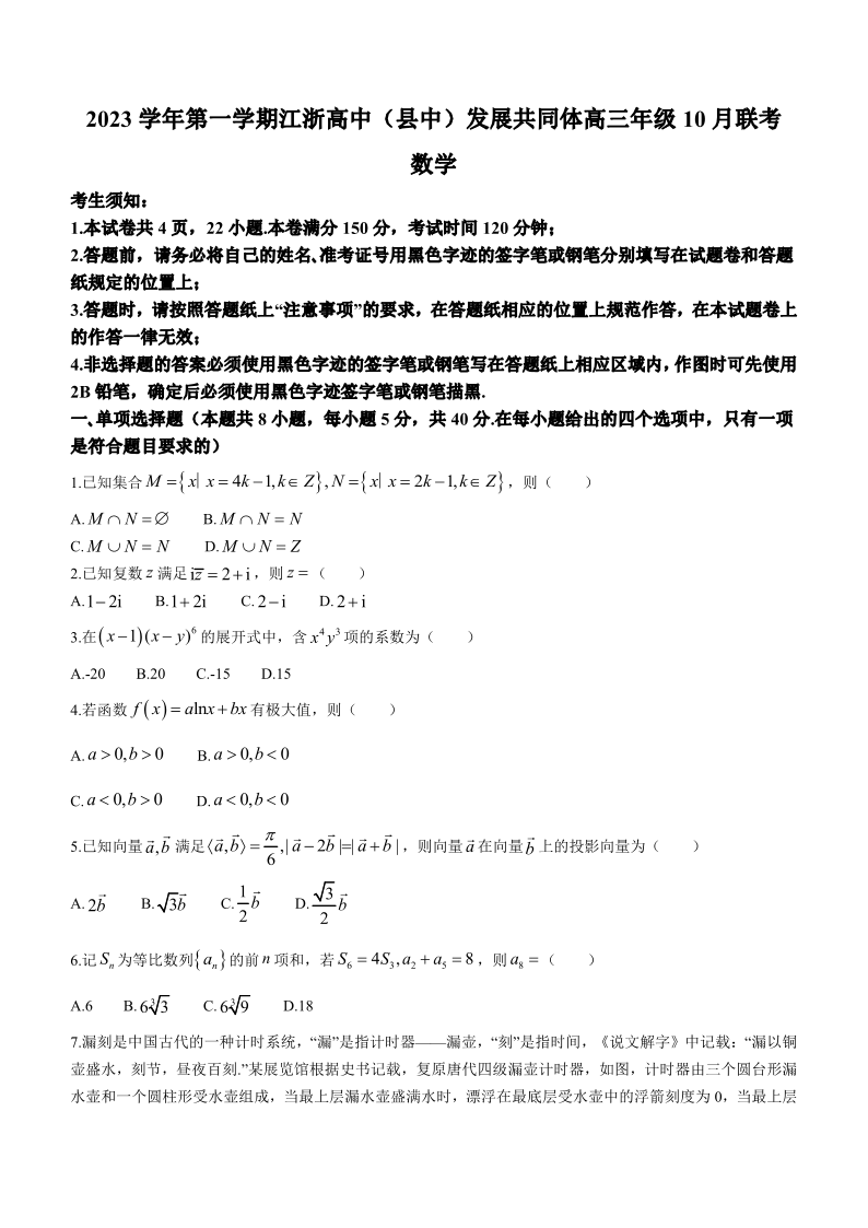 江苏省江浙高中发展共同体2023-2024学年高三上学期10月联考 数学