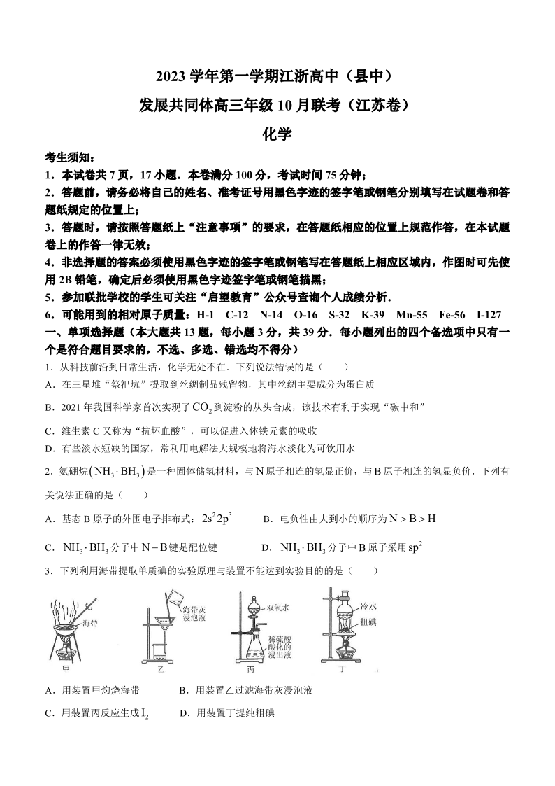 江苏省江浙高中发展共同体2023-2024学年高三上学期10月联考 化学