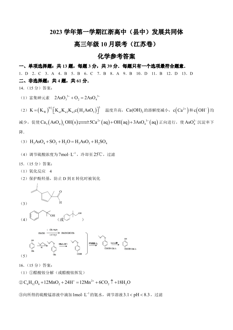 江苏省江浙高中发展共同体2023-2024学年高三上学期10月联考 化学答案
