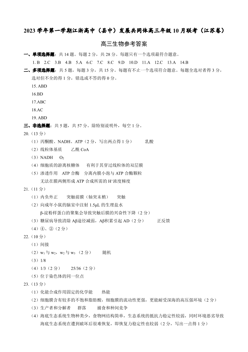 江苏省江浙高中发展共同体2023-2024学年高三上学期10月联考 生物答案