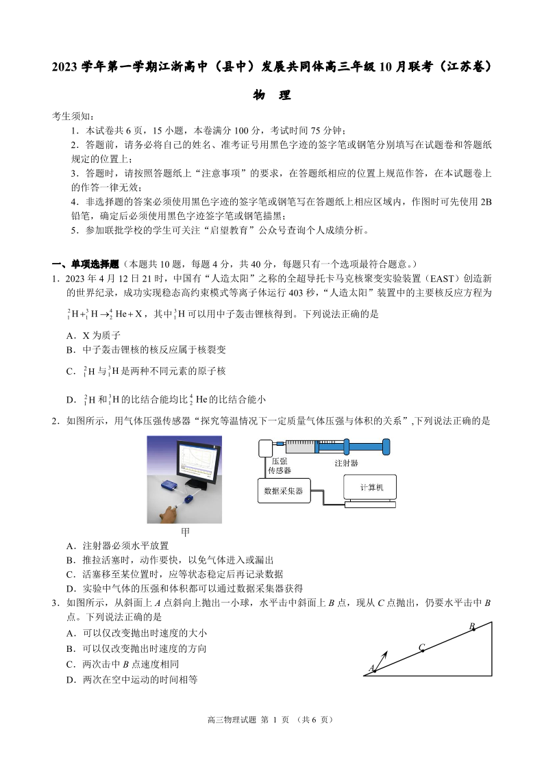 江苏省江浙高中发展共同体2023-2024学年高三上学期10月联考 物理