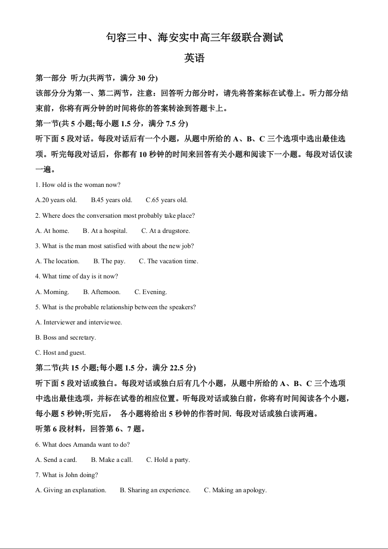 江苏省句容市第三中学、海安实验中学2023-2024学年高三上学期10月联考 英语答案