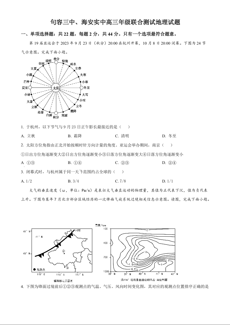 江苏省句容市第三中学、海安实验中学2023-2024学年高三上学期10月联考 地理