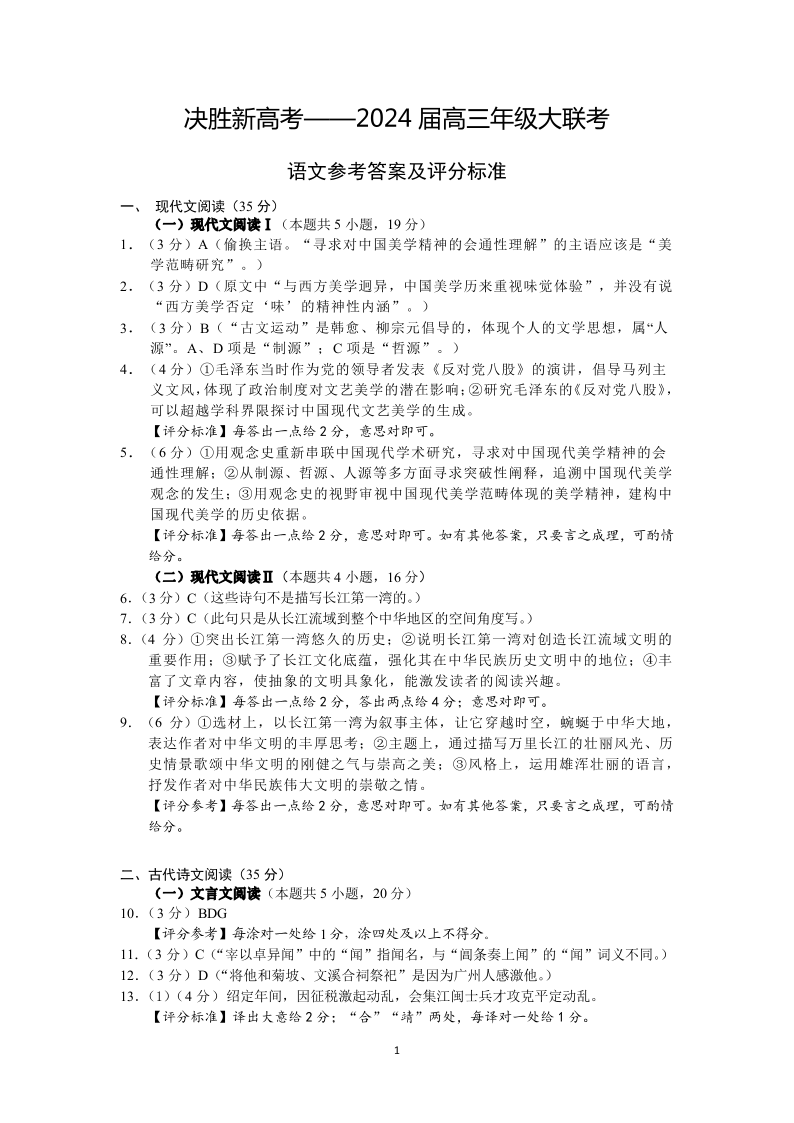 江苏省决胜新高考2023-2024学年高三上学期10月大联考 语文答案