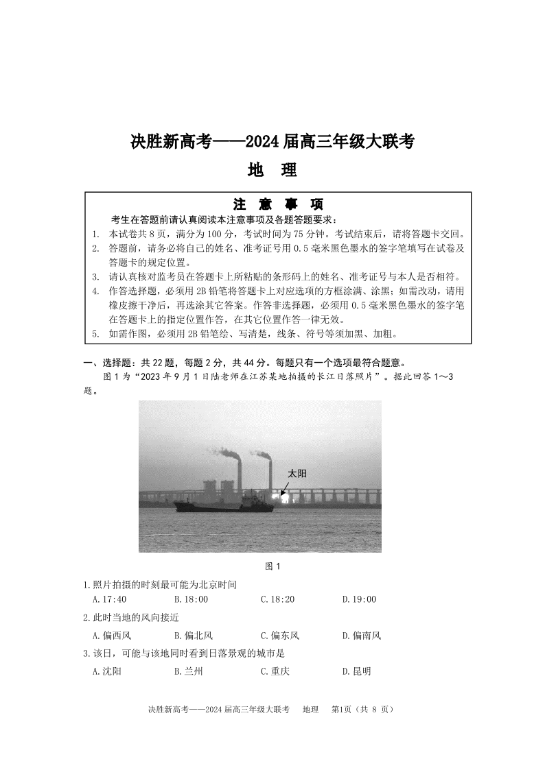 江苏省决胜新高考2023-2024学年高三上学期10月大联考 地理