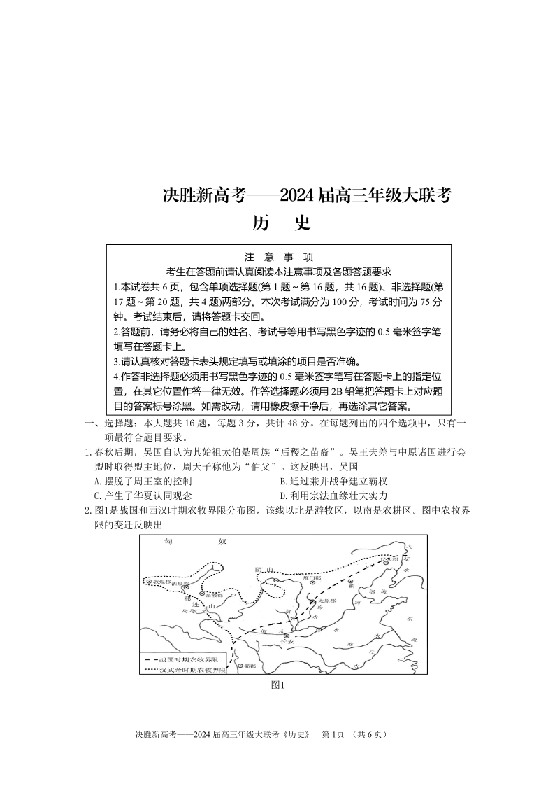 江苏省决胜新高考2023-2024学年高三上学期10月大联考 历史