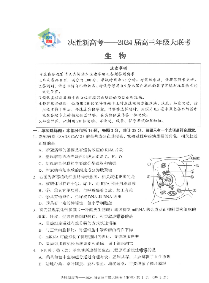 江苏省决胜新高考2023-2024学年高三上学期10月大联考 生物