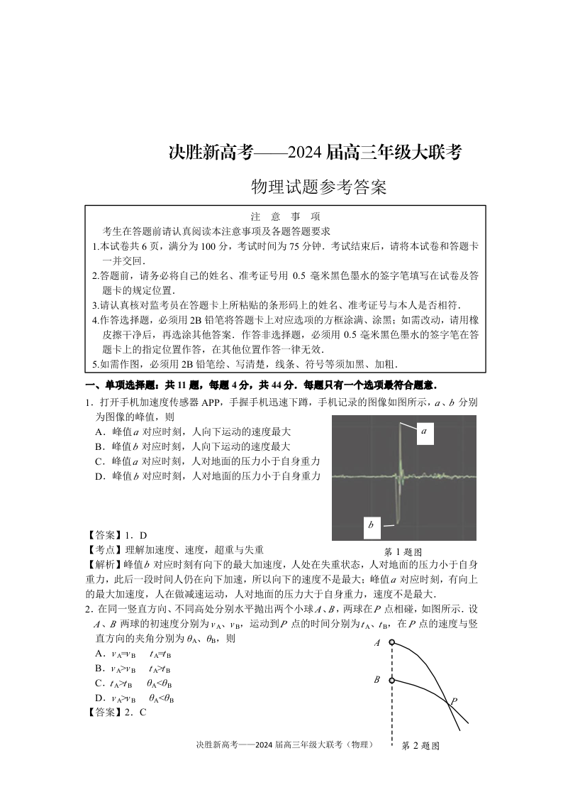江苏省决胜新高考2023-2024学年高三上学期10月大联考 物理答案