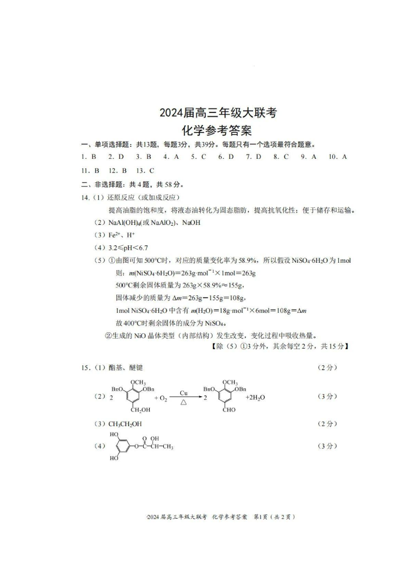江苏省决胜新高考2023-2024学年高三上学期12月大联考 化学答案