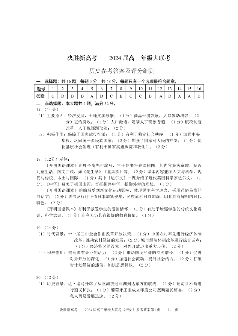 江苏省决胜新高考2023-2024学年高三上学期12月大联考 历史答案