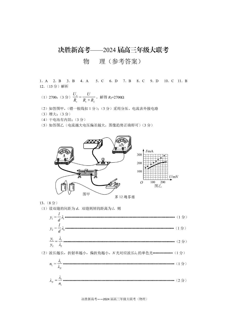 江苏省决胜新高考2023-2024学年高三上学期12月大联考 物理答案